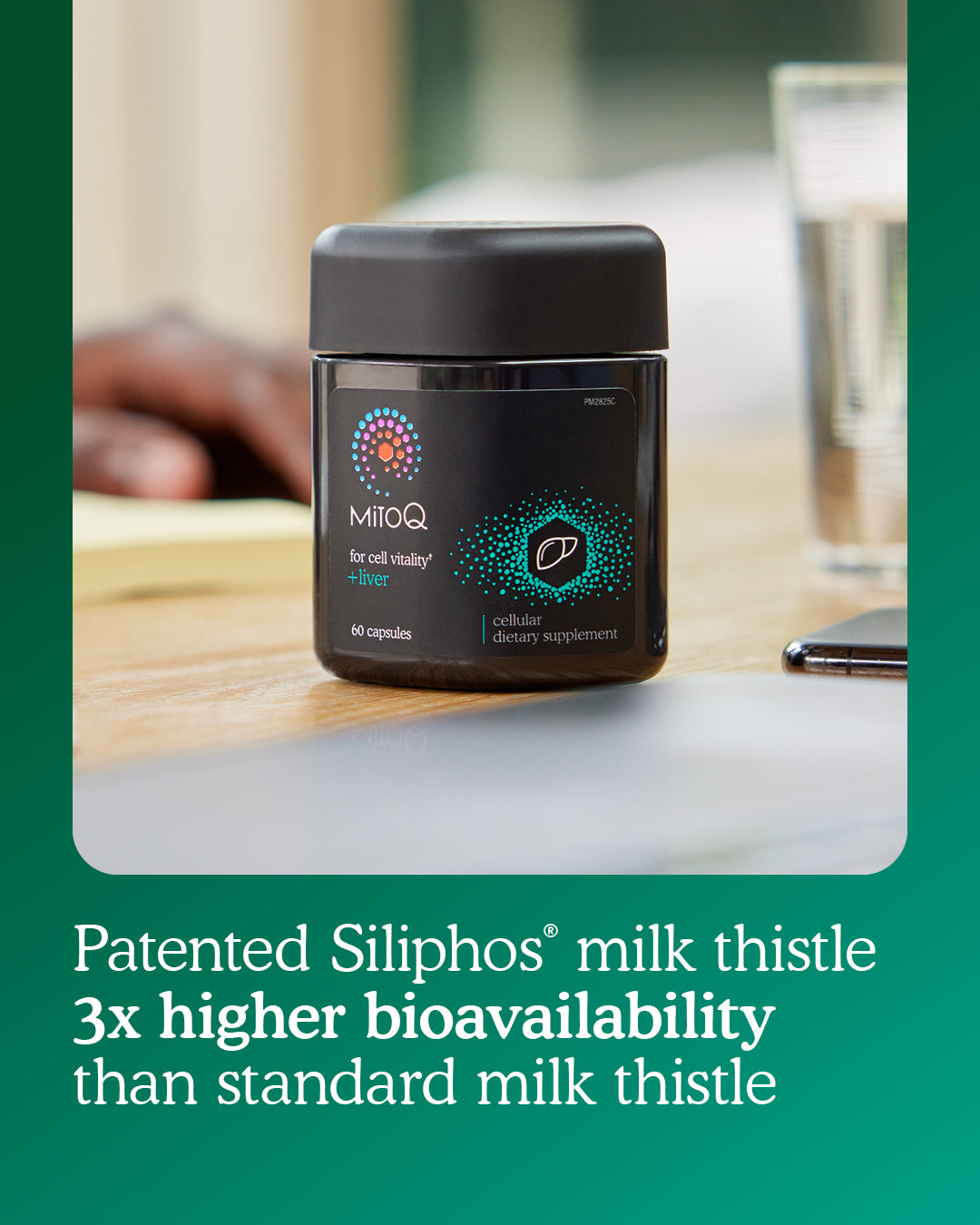 MitoQ +liver works at the cellular level to support mitochondrial function, helping your liver maintain energy for detoxification, metabolism, and cellular repair—so it can keep up with the demands of daily life.