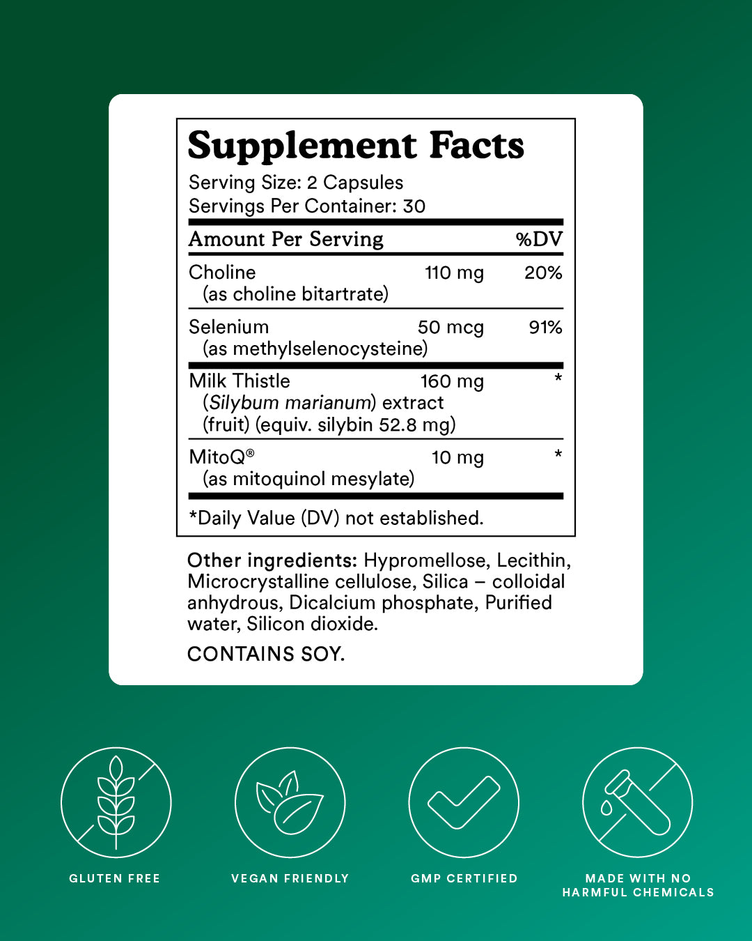 VitaCholine™ Choline (as choline bitartrate) 110mg, Selenium (as methylselenocysteine) 50mcg, 2 Siliphos® Milk thistle (Silybum marianum) extract (fruit) 160mg, 3 MitoQ® (as mitoquinol mesylate) 10mg