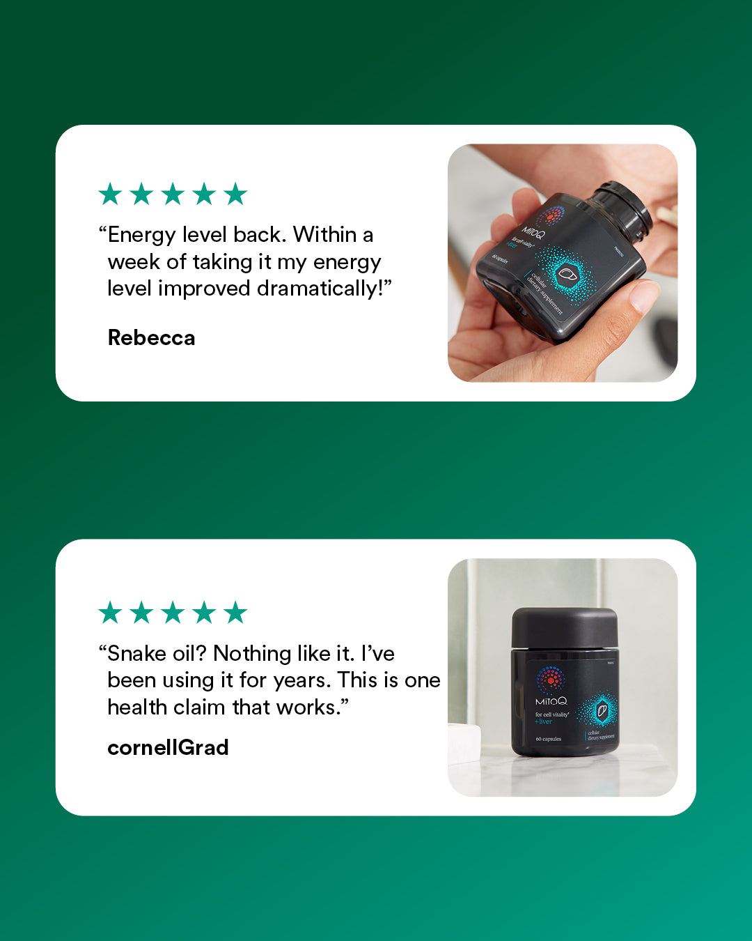 Everyone will experience MitoQ differently, depending on your age, your fitness, your overall health. It can take days, weeks or months for you to experience support for energy levels and health.
